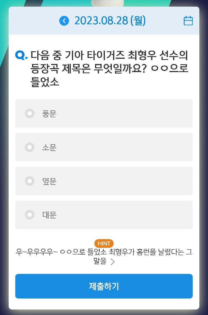 신한쏠, 야구상식 쏠퀴즈(23.08.28), 퀴즈정답, 기아 타이거즈 최형우 선수의 등장곡