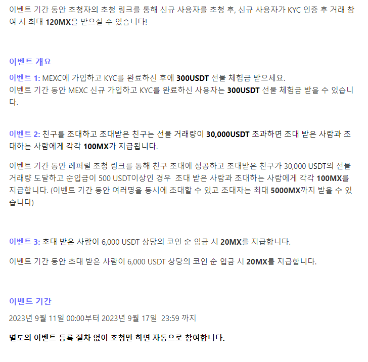 | MEXC 신규 사용자 최대 120MX+300USDT 지급( 추천 코드 : 1LCc2 ) (0) | 2023.09.25 |
