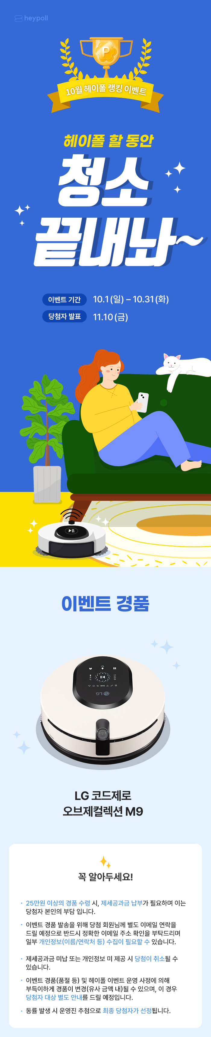 헤이폴에서 10월 랭킹 이벤트(헤이폴 할 동안 청소 끝내놔~)가 진행중이다. 랭킹 이벤트 경품으로 LG 코드제로 오브제컬렉션 M9이 지급된다.