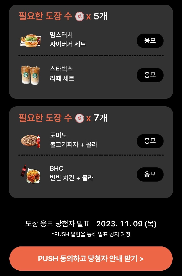 - 도장 5개 : 맘스터치 싸이버거 세트, 스타벅스 라떼 세트