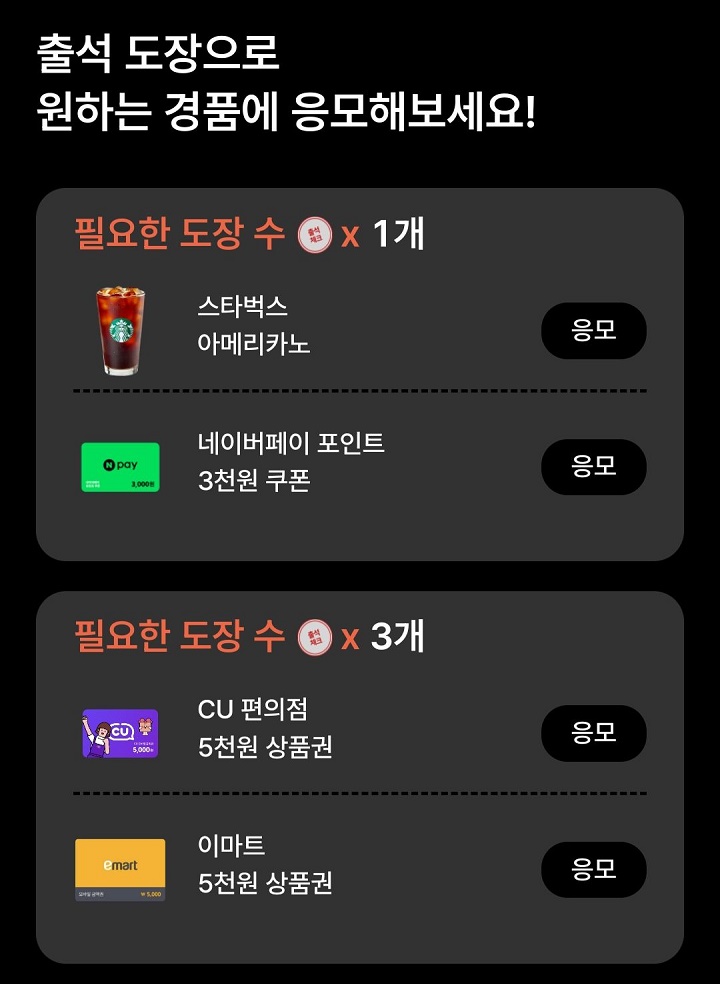 - 도장 1개 : 스타벅스 아메리카노, 네이버페이 포인트 3천원 쿠폰