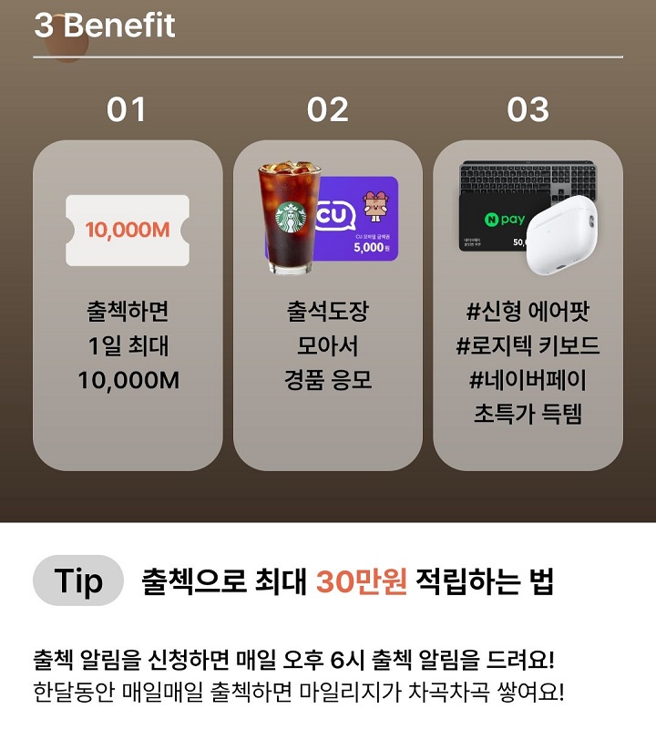 - 출첵하면 1일 최대 10,000M