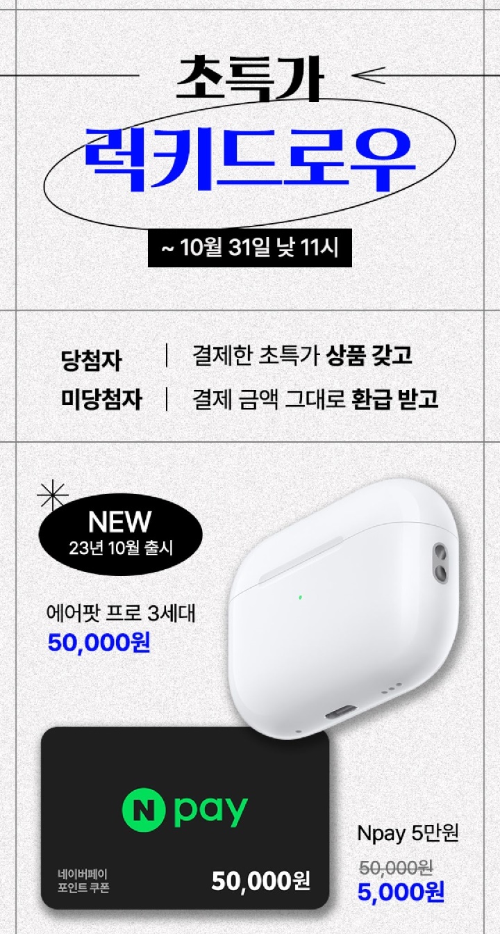 - 초특가 럭키드로우 : 에어팟 프로 3세대(50,000원), 네이버페이 5만원(5,000원), 로지텍 MX KEYS S for windows(10,000원)