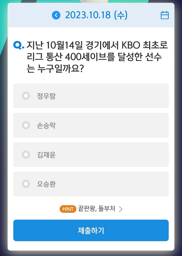 | 신한쏠, 야구상식 쏠퀴즈(23.10.17), KBO 리그 관중수는 2018년 이후 (0) | 2023.10.17 |