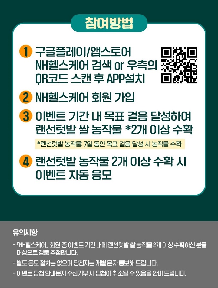 ▶ 대상 : 기간 내 NH헬스케어 앱 랜선텃밭 쌀 농작물 2개 이상 수확시 자동 응모