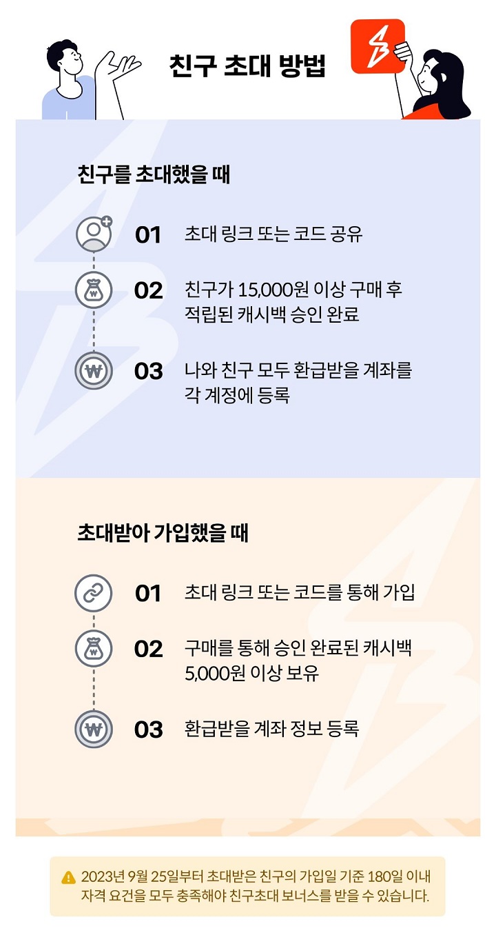 * 2023년 9월 25일부터 초대받은 친구의 가입일 기준 180일 이내 자격 요건을 모두 충족해야 친구초대 보너스를 받을 수 있다.