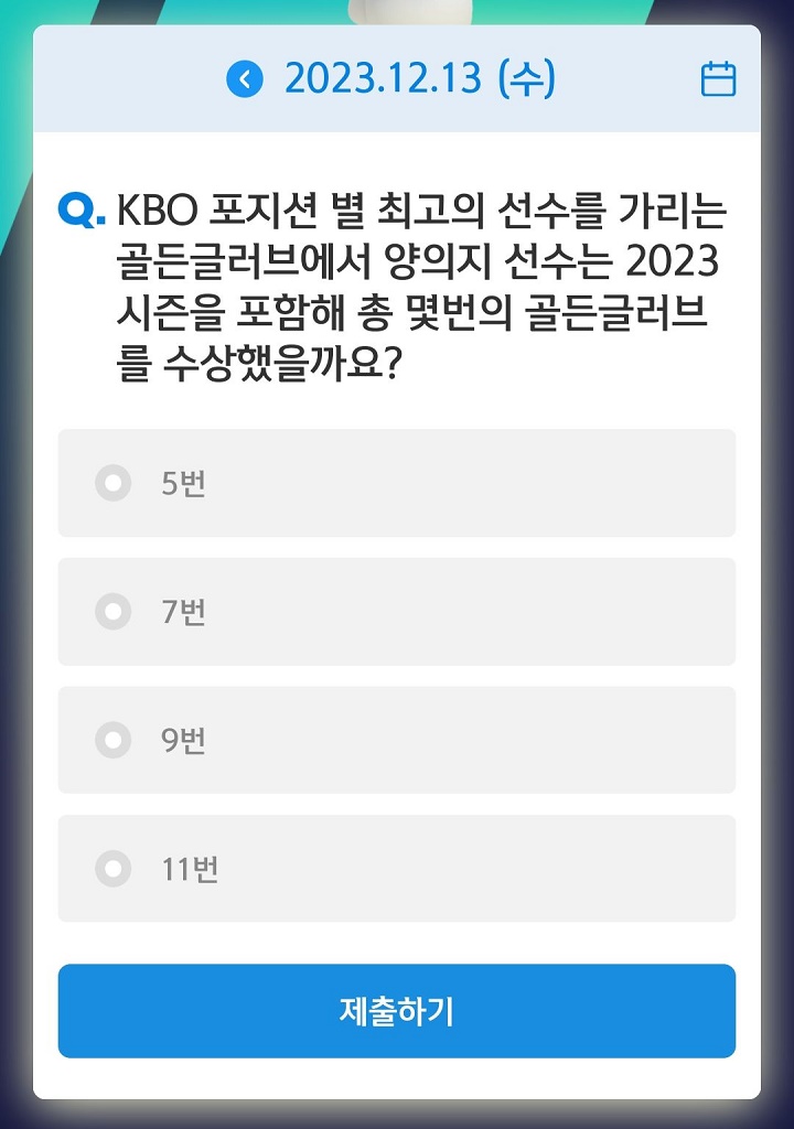 신한쏠, 야구상식 쏠퀴즈(23.12.13), 퀴즈정답, 양의지 선수는 2023 시즌을 포함해서 몇번