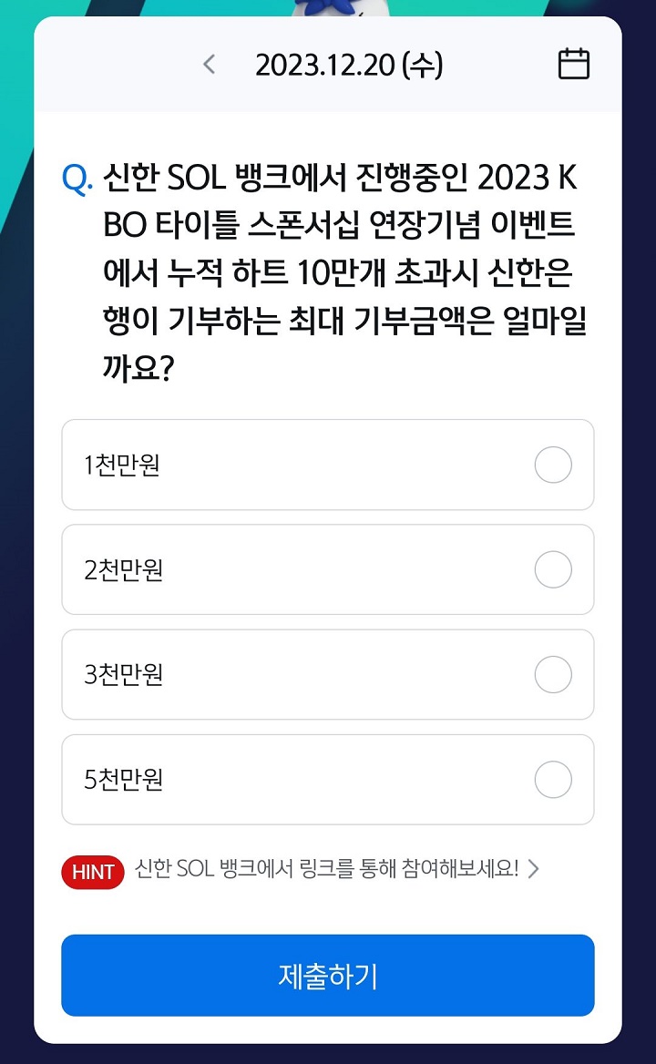 신한쏠, 야구상식 쏠퀴즈(23.12.20), 퀴즈정답, KBO 타이틀 스폰서십 연장기념 이벤트