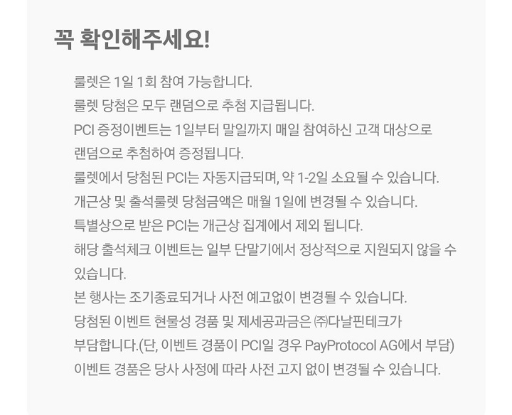 - 당첨된 이벤트 현물성 경품 및 제세공과금은 ㈜다날핀테크가 부담한다.(단, 이벤트 경품이 PCI일 경우 PayProtocol AG에서 부담).