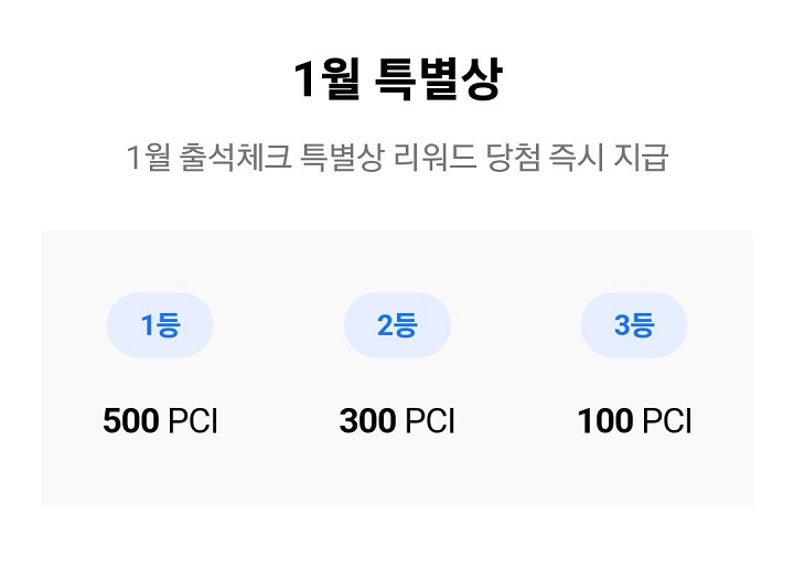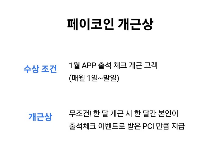 - 개근상 : 무조건! 한 달 개근 시 한 달간 본인이 출석체크 이벤트로 받은 PCI 만큼 지급