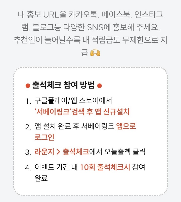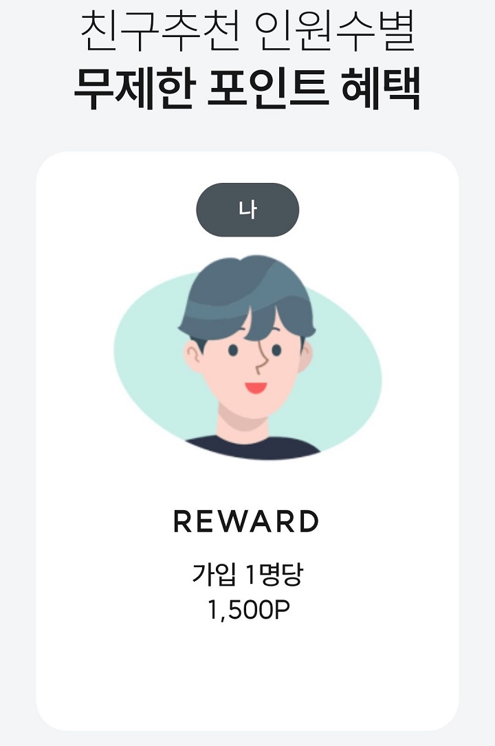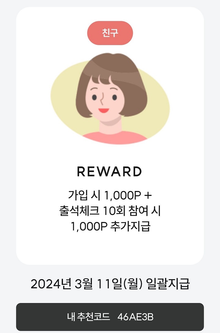 - 친구 : 가입 시 1,000P + 출석체크 10회 참여 시 1,000P 추가지급