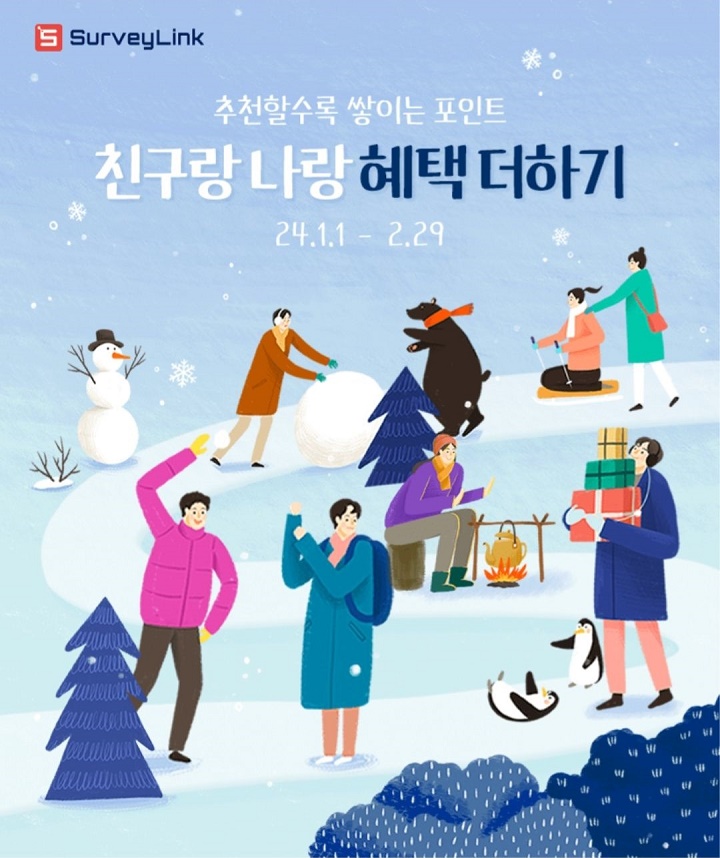 서베이링크(surveylink) 서베이링크 친구초대 이벤트가 진행중이다. 초대받은 친구가 추천코드 입력하고 가입하면, 친구도 나도 포인트가 적립된다.