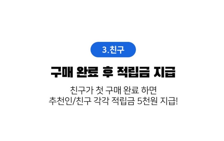 - 친구가 첫 구매하면 친구랑 나랑 적립금 5천원씩 지급