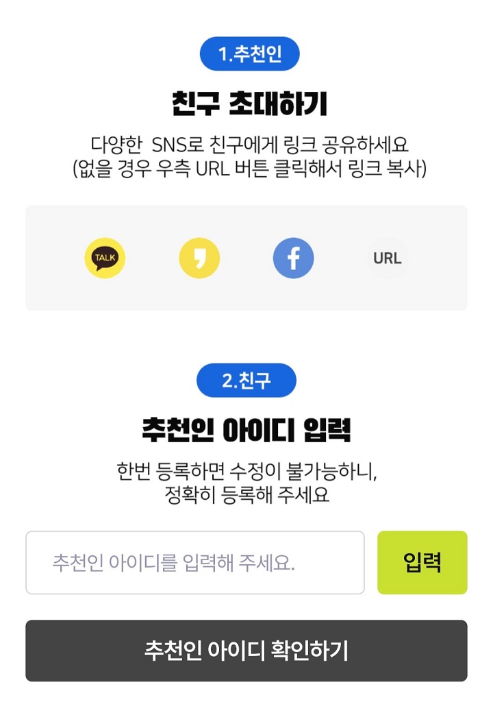 친구초대는 초대받은 친구가 가입후 추천인 아이디를 입력하고, 첫주문을 완료하면 추천인과 친구에게 적립금 5천원이 지급된다. 회원가입후 자신이 추천인이 되어 여러명의 친구를 초대하면 적립금을 추가로 받을 수 있다.