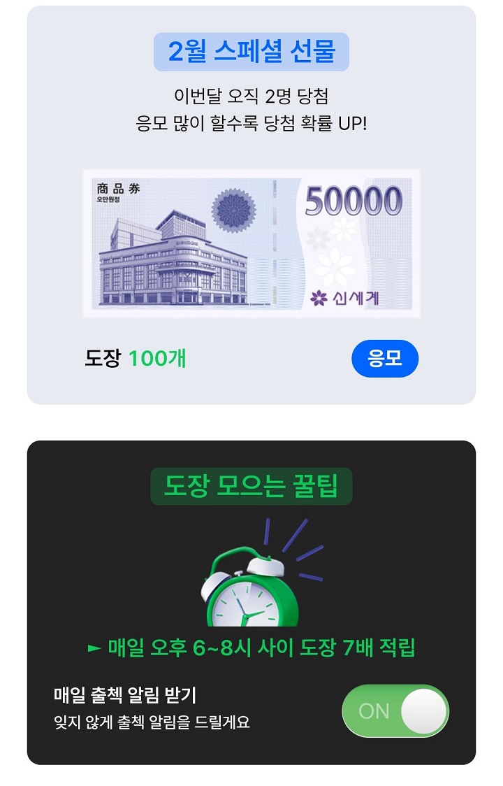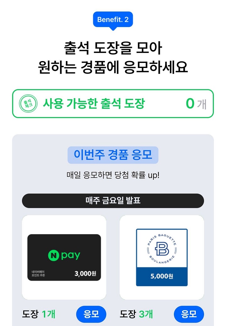 - 출석 도장으로 원하는 경품 응모