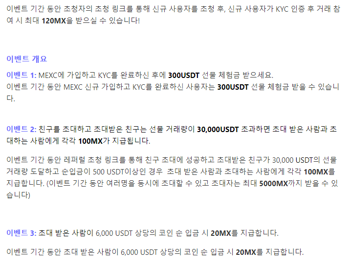 - 이벤트 기간 동안 레퍼럴 초청 링크를 통해 친구 초대에 성공하고 초대받은 친구가 30,000 USDT의 선물 거래량 도달하고 순입금이 500 USDT이상인 경우 초대 받은 사람과 초대하는 사람에게 각각 100 MX를 지급합니다. (이벤트 기간 동안 여러명을 동시에 초대할 수 있고 초대자는 최대 5000MX까지 받을 수 있다)
