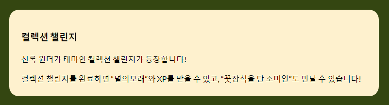- 컬렉션 챌린지를 완료하면 “별의모래”와 XP를 받을 수 있고, “꽃장식을 단 소미안”도 만날 수 있다!