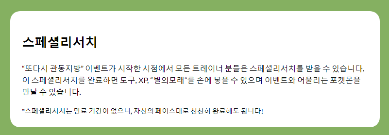 - “또다시 관동지방” 이벤트가 시작한 시점에서 모든 트레이너는 스페셜리서치를 받을 수 있다. 이 스페셜리서치를 완료하면 도구, XP, “별의모래”를 손에 넣을 수 있으며 이벤트와 어울리는 포켓몬을 만날 수 있습니다.