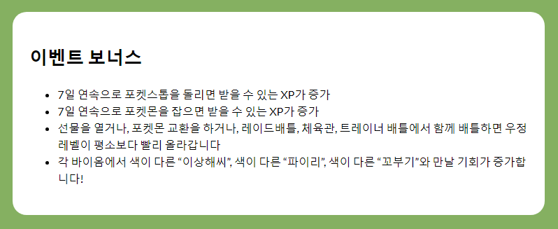 - 7일 연속으로 포켓몬을 잡으면 받을 수 있는 XP가 증가