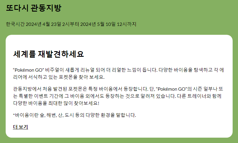 포켓몬고(Pokémon GO)에서 또다시 관동지방 이벤트가 2024년 4월 23일 2시부터 2024년 5월 10일 12시까지 진행된다.