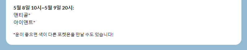 - 5월 8일 10시~5월 9일 20시: 앤티골, 아이앤트