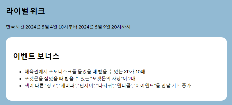 포켓몬고(Pokémon GO)에서 라이벌 위크 이벤트가 한국시간 2024년 5월 4일 10시부터 2024년 5월 9일 20시까지 진행된다.