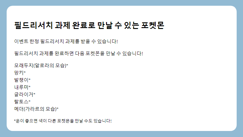 ▶ 필드리서치 과제 완료로 만날 수 있는 포켓몬