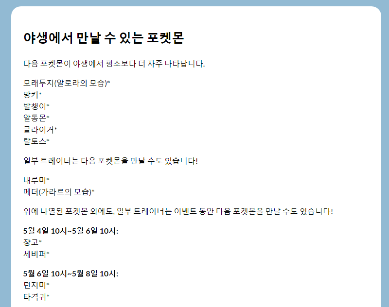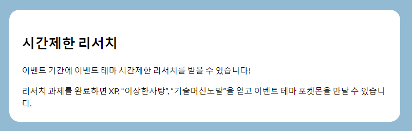 - 이벤트 한정 필드리서치 과제를 받을 수 있다! 필드리서치 과제를 완료하면 다음 포켓몬을 만날 수 있다!