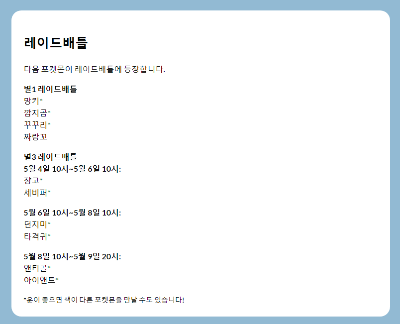 - 5월 6일 10시~5월 8일 10시: 던지미, 타격귀
