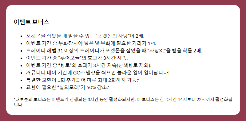 - 대부분의 보너스는 이벤트가 진행되는 3시간 동안 활성화되지만, 이 보너스는 한국시간 14시부터 22시까지 활성화된다.