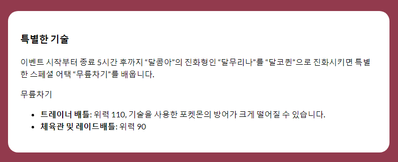 - 이벤트 시작부터 종료 5시간 후까지 “달콤아”의 진화형인 “달무리나”를 “달코퀸”으로 진화시키면 특별한 스페셜 어택 “무릎차기”를 배운다.