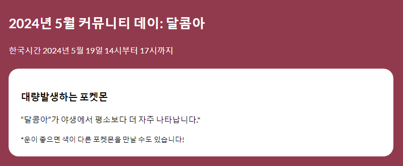 포켓몬고(Pokémon GO)에서 5월 커뮤니티 데이: 달콤아 이벤트가 2024년 5월 19일 14시부터 17시까지 진행된다.